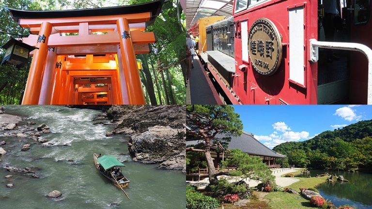 從伏見稻荷到嵐山小火車、保津川遊船,再漫遊竹林,最後參觀天龍寺和渡月橋。
